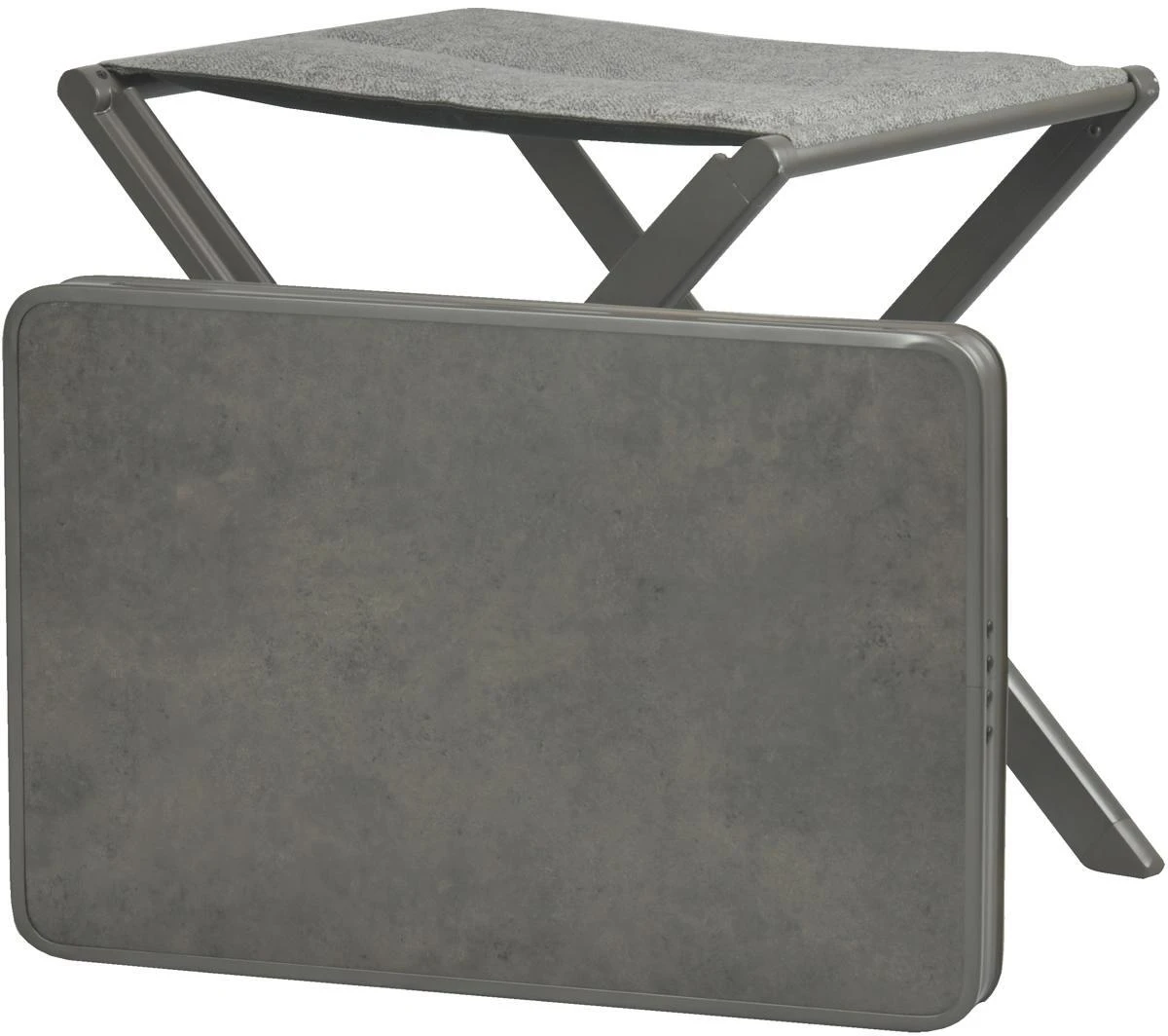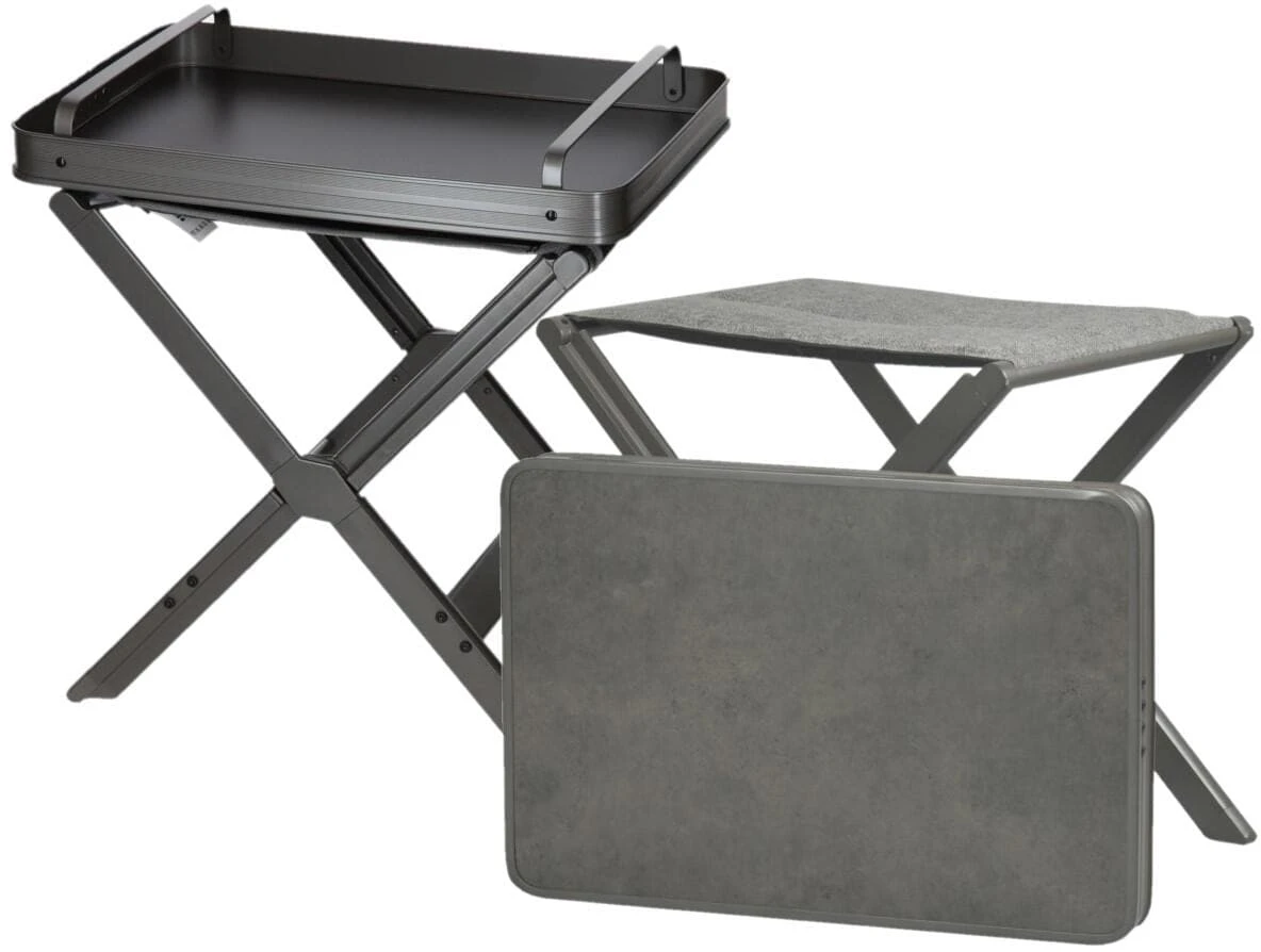 Hocker-Set bestehend aus einem bequemen, stabilen Falthocker und aus einer Tischplatte.